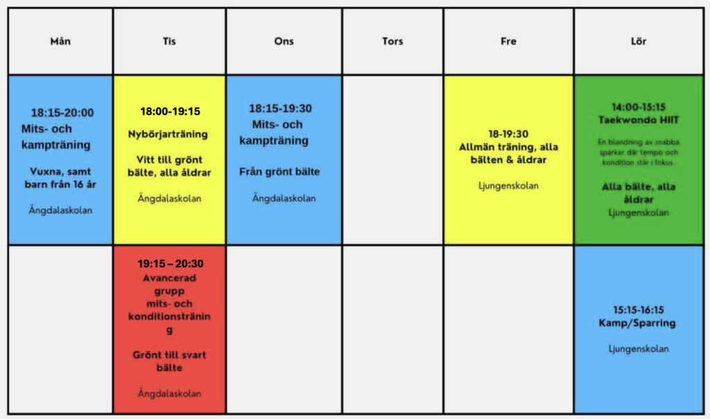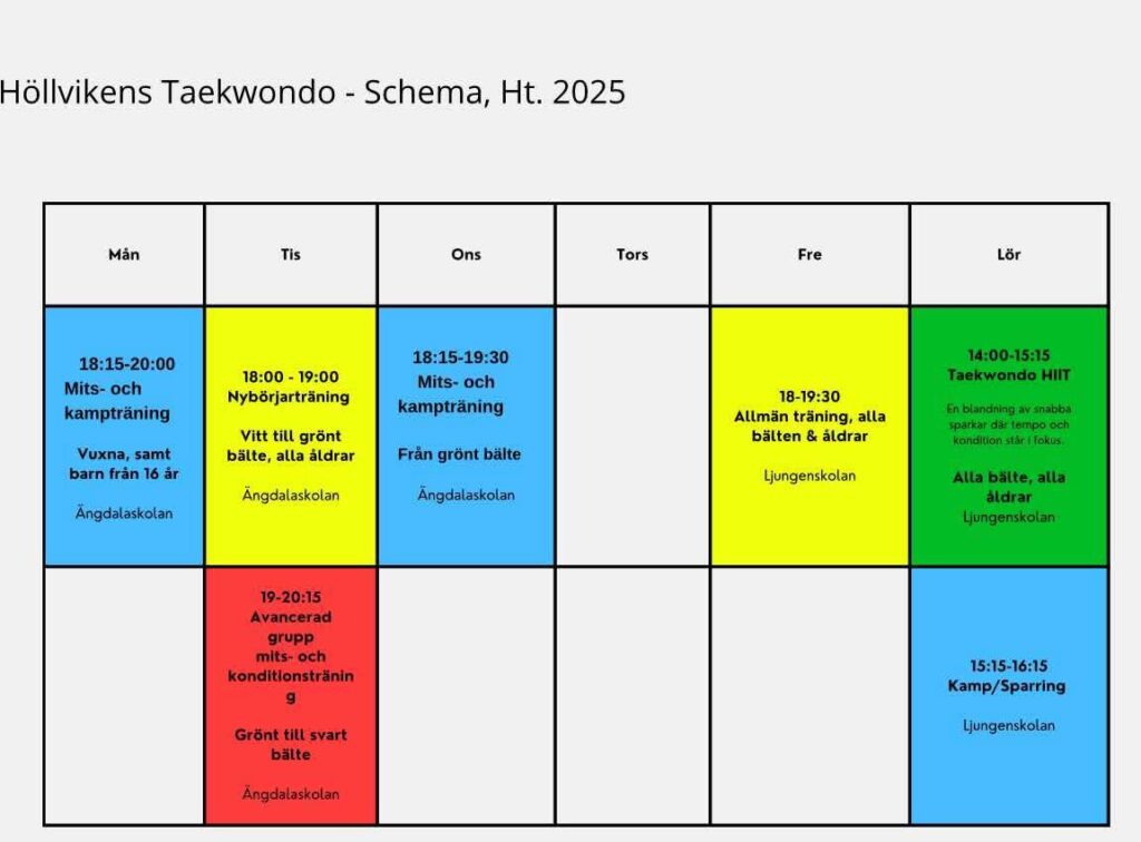 Träningstider för nybörjare (barn, ungdomar och vuxna).